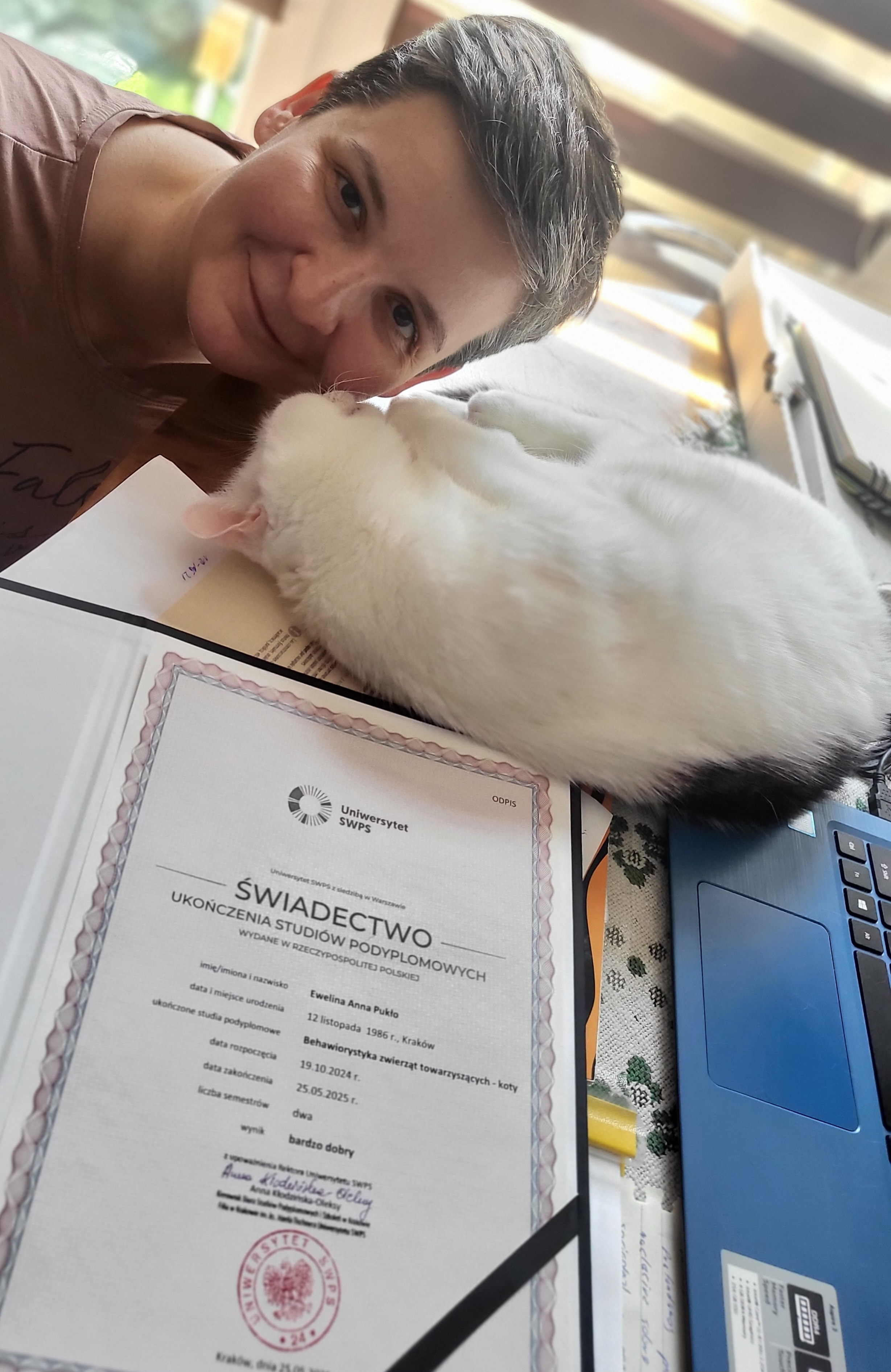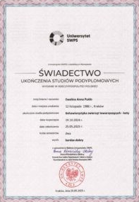 Chcę, żebyście wiedzieli, iż zawód behawiorysty nie jest prawnie uregulowany. Onacza to, że każdy po kilkugodzinnym kursie on-line może nazwać się behawiorystą. Dlatego tak podkreślam, że ukończyłam studia na renomowanej uczelni, a nie tylko kursy. Wszystkie szkolenia czy webinary to tylko forma doszkalania, poszerzania swojej wiedzy, a nie podstawa tego zawodu.